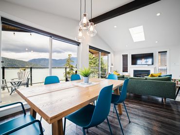 This stylish home has a beautiful full sized dining table in the dining area overlooking the bay in Port Renfrew. It's the perfect spot to enjoy a meal together and play some board games too.
