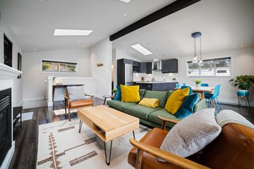 Upstairs, an open concept living space is stylishly appointed with a dining area, living room, and full kitchen. Skylights fill the space with natural light, and a full wall of sliding glass doors leading out to the private balcony ensures that you never miss a moment of the spectacular ocean views— whether you decide to BBQ on the deck or whip up a meal inside. Quartz countertops and stainless steel full sized appliances, including a dishwasher, provide everything you’ll need for the comforts of home. The dining area features a full sized table with room for all, and there’s plenty of comfy seating around the gas fireplace. Cozy up here after an evening of adventures to relax, and make use of the Starlink high-speed internet connection and SmartTV. This main level also features a full bath.